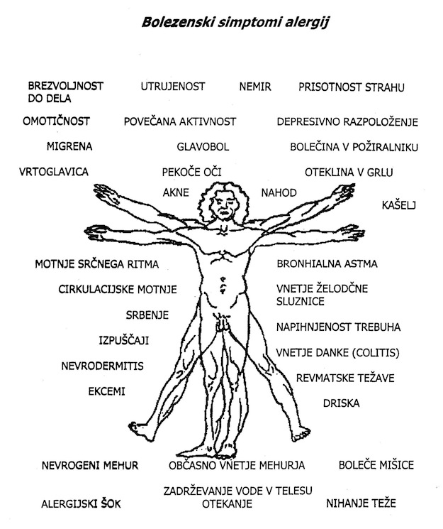 KRONIČNE (CENTRALNE) ALERGIJSKE OBLIKE Običajno nastanejo pri dedno močno obremenjenih ljudeh, pogosto že v zgodnjem otroštvu. Senzibilizacijo povzroči običajno neko temeljno živilo, ki ga telo absorbira pogosto, praviloma dnevno (mleko, pšenica). Senzibilizacijo pa lahko povzroči tudi snov, ki je trajno zastopana v telesu (npr. sev glivic pri kronični črevesni mikozi, živo srebro pri tistih, ki imajo v zobovju amalgamska polnjenja). Pri pogostem in stalnem stiku z alergenom so pojavi alergije skoraj vedno maskirani (zakriti), kar pomeni, da povezanost med simptomom in alergenom ni prepoznavna. |